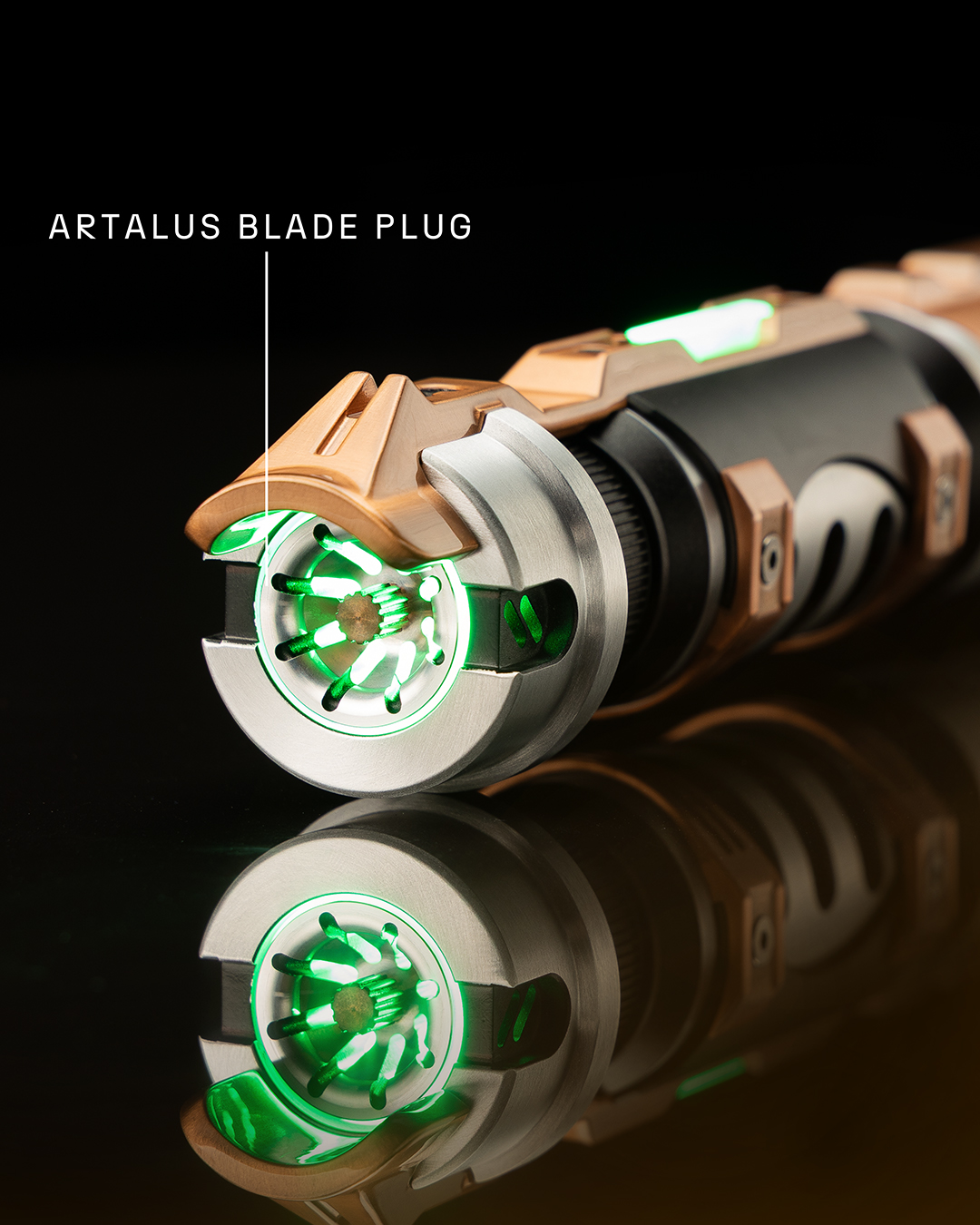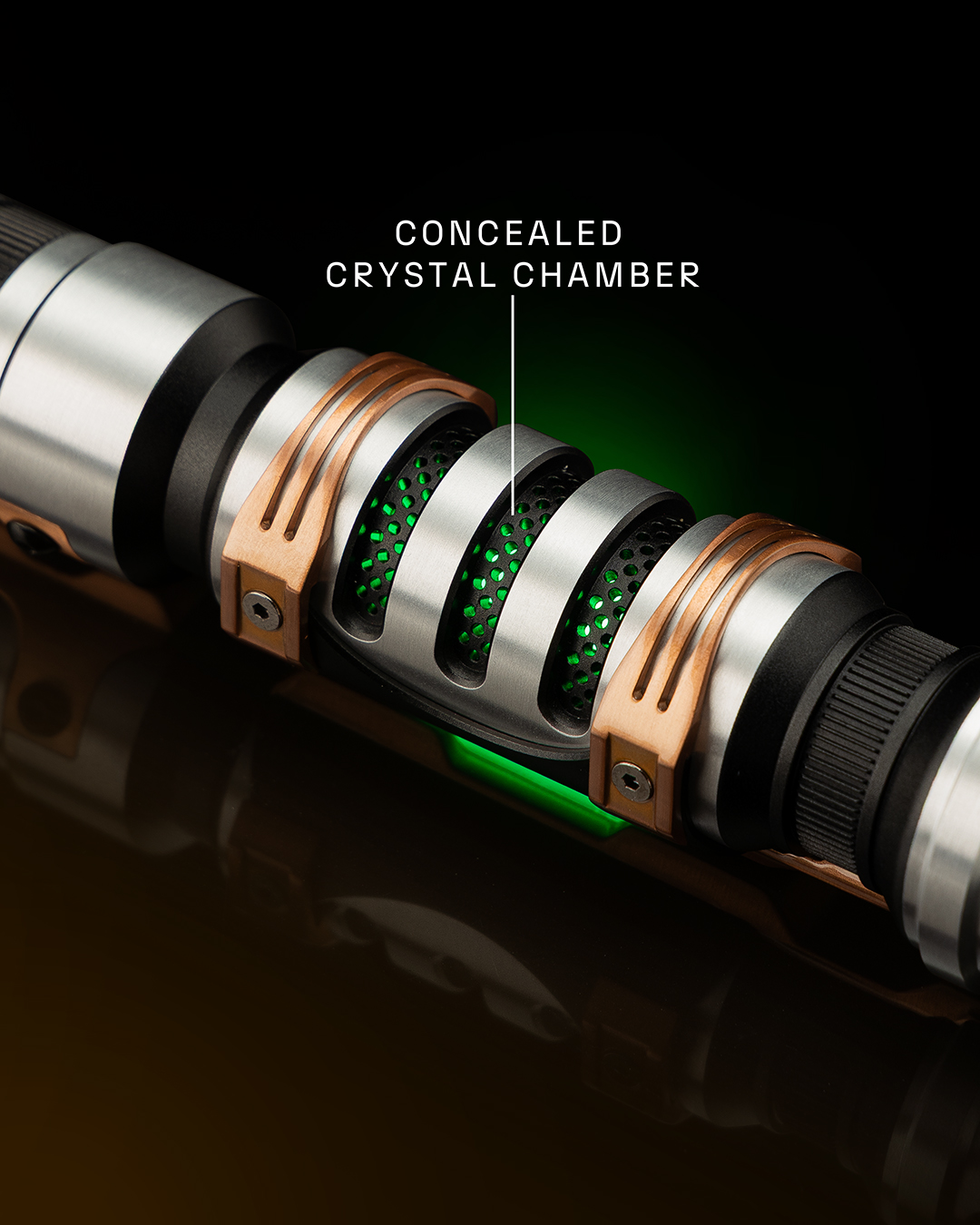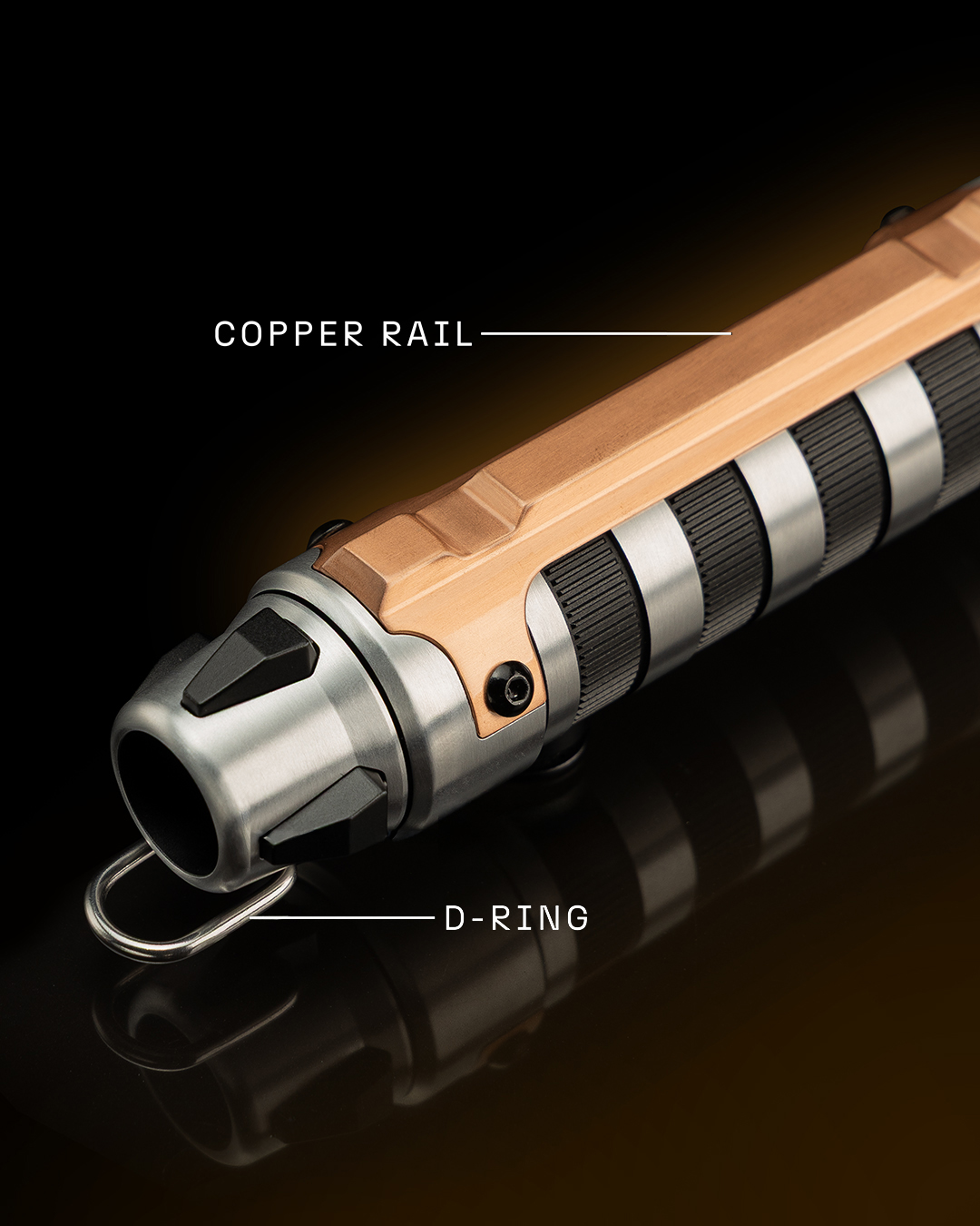 パワーコア標準装備、オリジナルブレードプラグ付きです。高級カスタムライトセーバーのセイバースミス(ライトセーバー制作者)である、スターフォールセイバーとセイバートリオとのコラボレーションセイバー。スイッチとバーグラフが内蔵された銅のレールが全体のデザインを形作っています。またクリスタルチャンバーには細孔が施され、起動すると光が漏れるのが特徴的です。